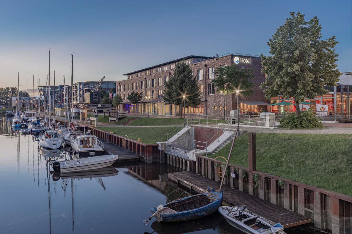 The Hotel Stadthafen Stade is located directly at the city harbor of Stade and vis à vis the old town. In addition to the local museum ship Greundiek, the harbor hosts many boats and yachts throughout the year. The hotel is part of a complex of buildings with a cinema, bowling and gastronomic facilities. The train station of Stade is within 10 minutes walking distance.